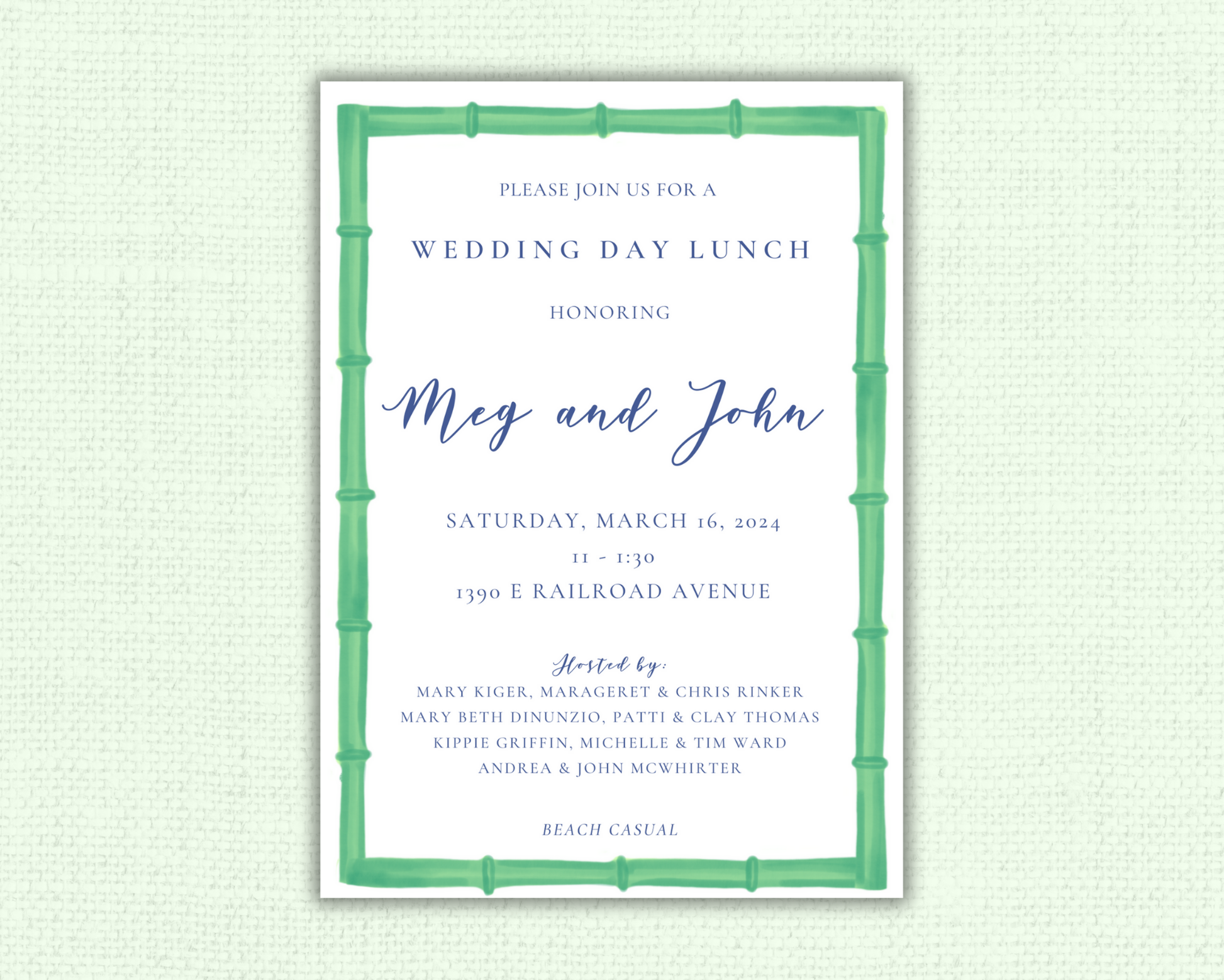 Host a timeless and elegant gathering with our green watercolor bamboo bridal luncheon invitations. Featuring a classic bamboo motif with fresh watercolor greenery, these invitations blend grandmillennial style with Southern charm — perfect for a sophisticated bridal celebration.