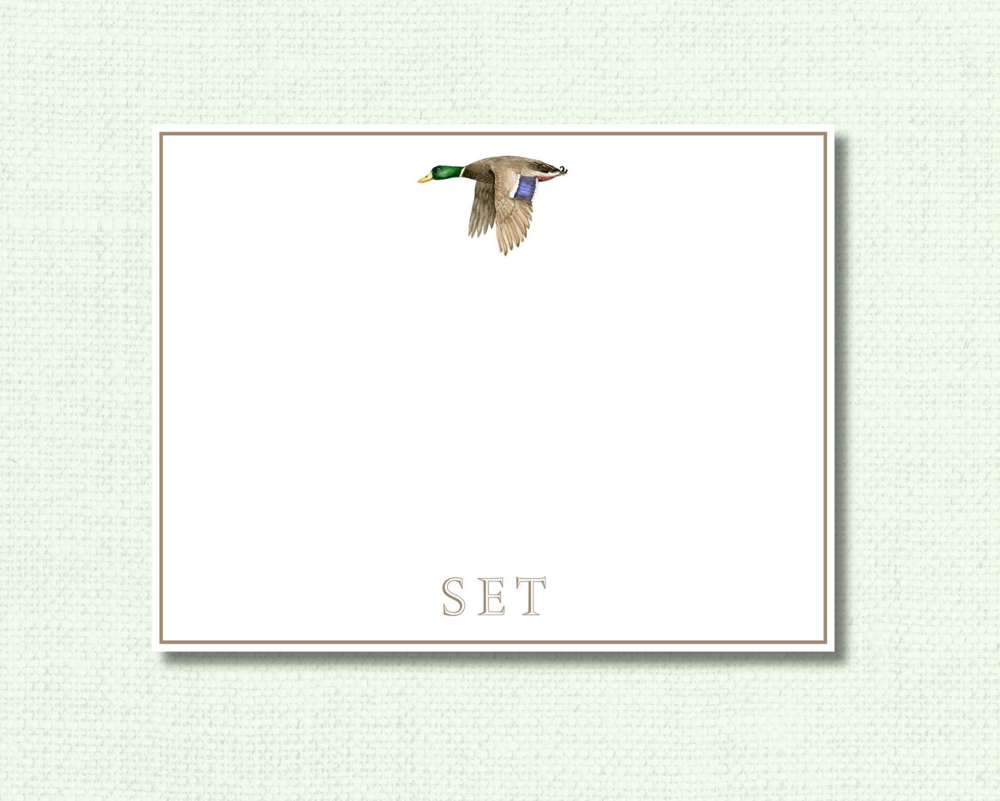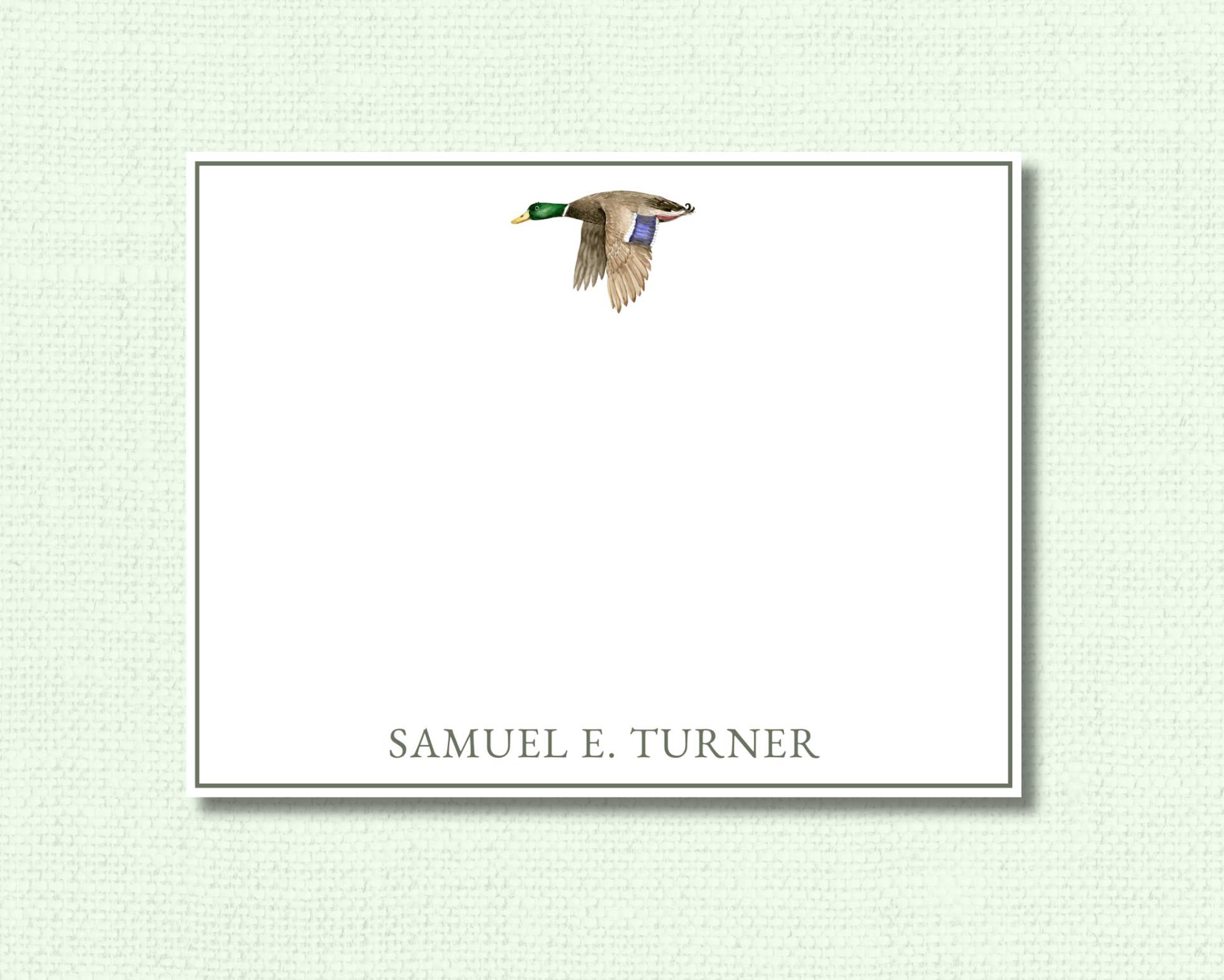 Bring classic, Southern charm to your correspondence with our personalized mallard duck notecards. Featuring a beautifully illustrated watercolor mallard and your custom name or monogram, these notecards are perfect for thank-you notes, outdoor enthusiasts, and thoughtful gifts.