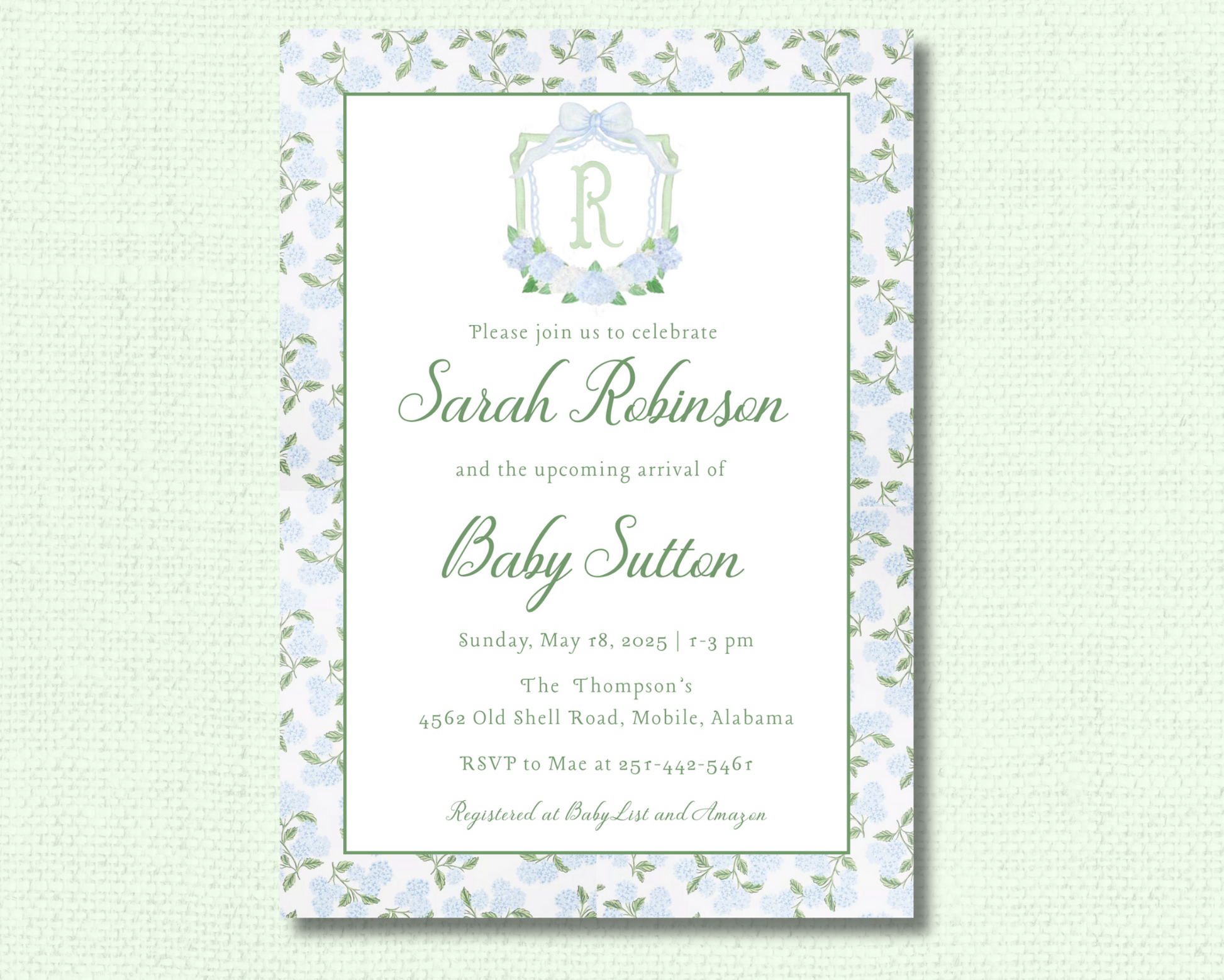 Welcome little one in timeless style with our Hydrangea Crest Baby Shower Invitation. Featuring a soft watercolor crest and classic monogram, this design is perfect for celebrating a baby boy with a touch of Southern charm and elegance.