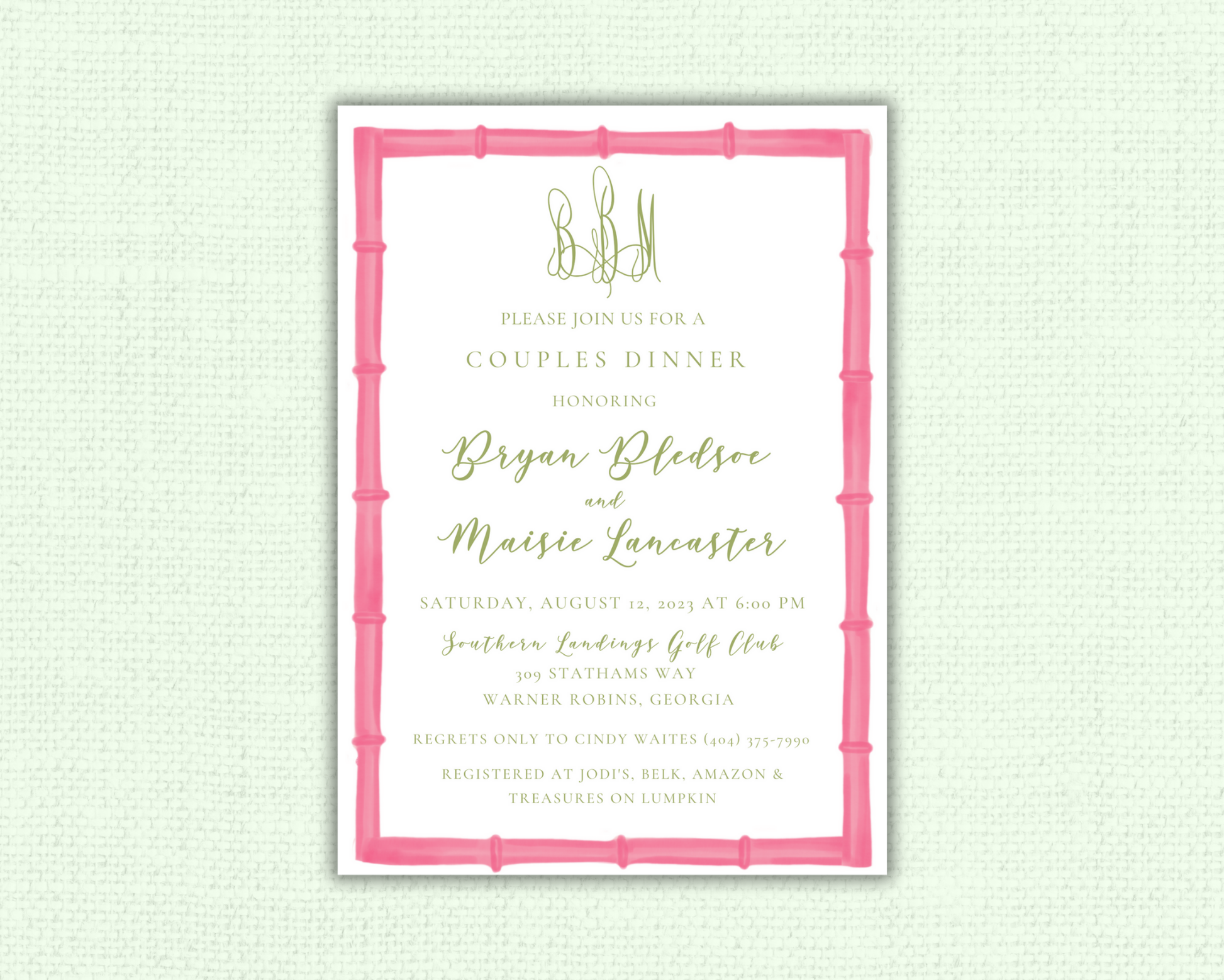 Host a timeless and elegant gathering with our pink watercolor bamboo bridal luncheon invitations. Featuring a classic bamboo motif with soft blush pink watercolor accents, these invitations blend grandmillennial style with Southern charm — perfect for a sophisticated bridal celebration.