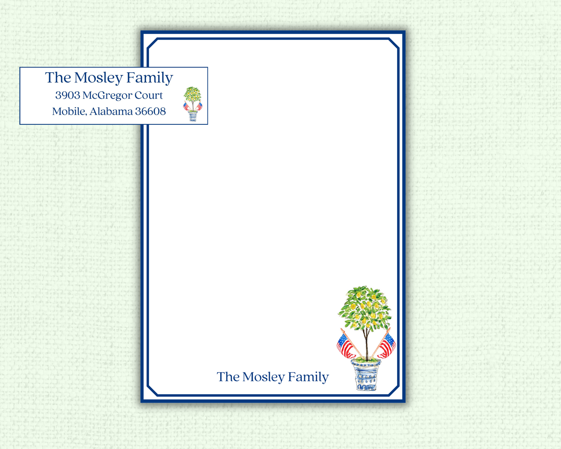 • Features a watercolor boxwood topiary with USA flags and your custom family name or monogram