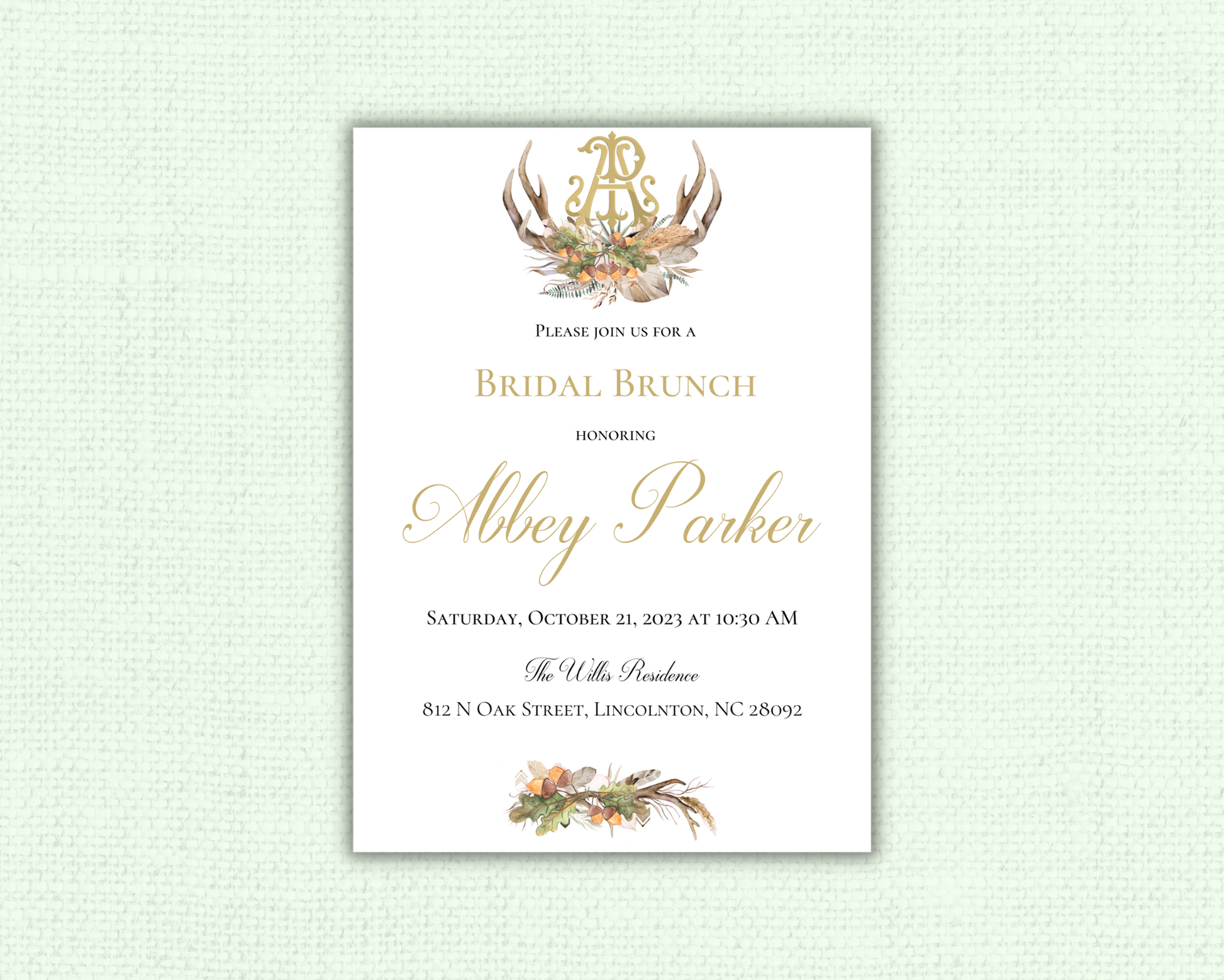 Gather friends and family to celebrate the bride-to-be with our rustic-chic fall bridal brunch invitations. Featuring a charming antler crest accented with autumn florals, these invitations set the perfect tone for a cozy and elegant gathering.